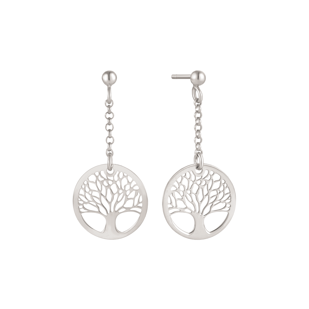 Sølv ørehænger rhodineret kæde med livets træ i cirkel. Mål: 15 mm. i diameter.